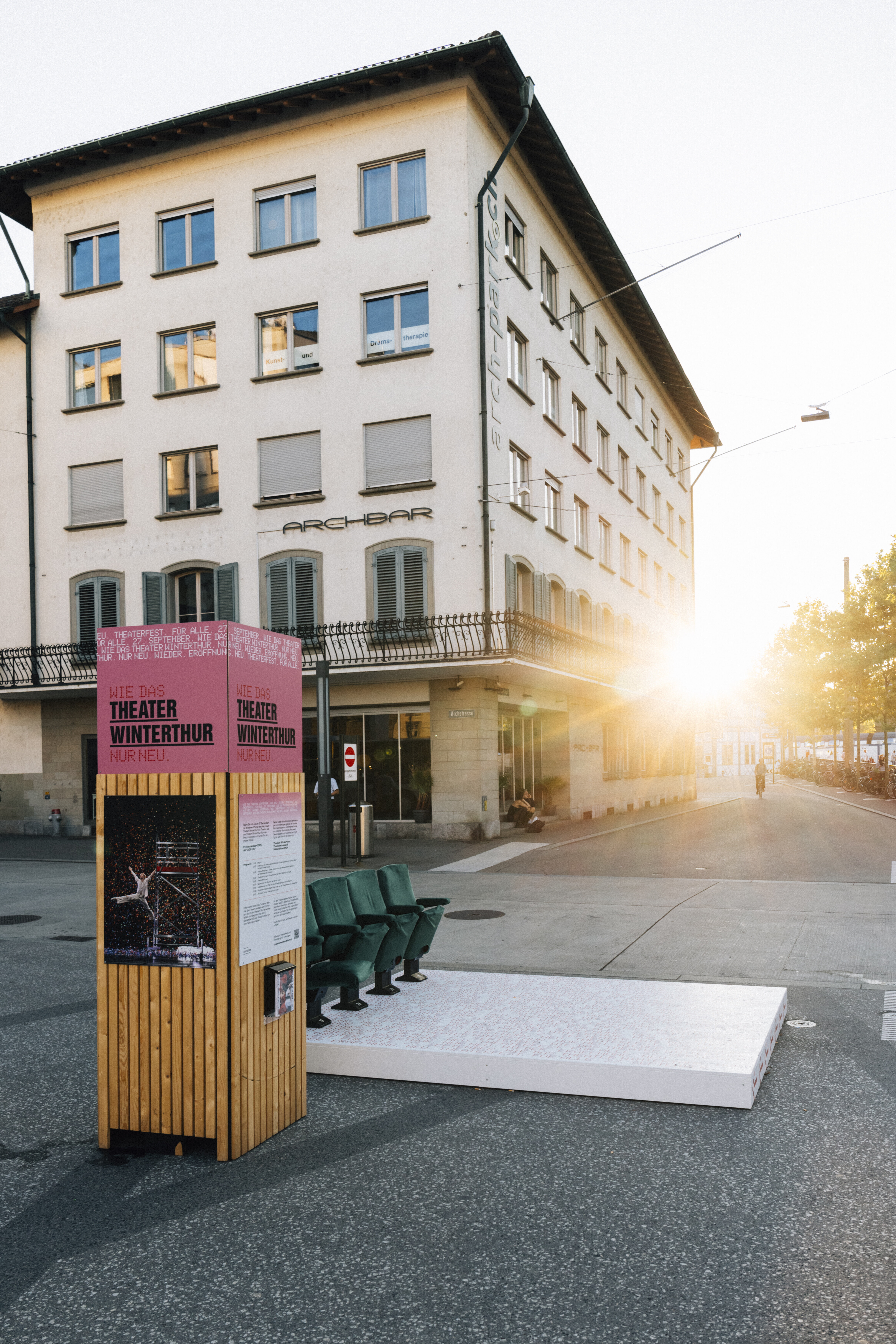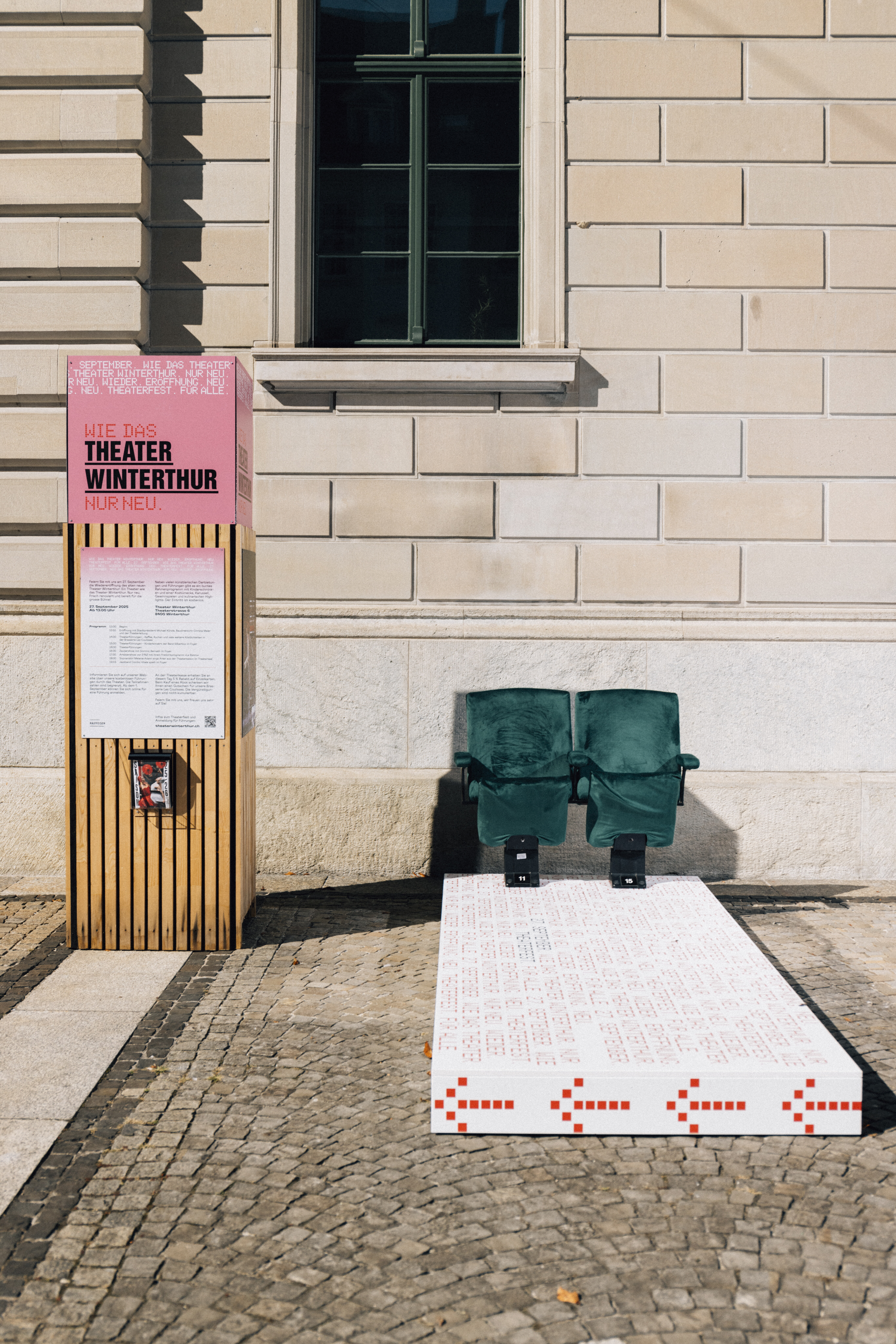In den zwei Wochen vor der Wiedereröffnung tauchten in der Winterthurer Altstadt an zentralen Standorten grüne Theatersessel auf. Passant:innen konnten Platz nehmen, im neuen Saisonprogramm blättern und sich über das Programm des Theaterfests informieren. Einen weiteren Höhepunkt bildete ein imposanter roter Teppich quer durch die Stadt, vom Bahnhof bis zum Theater, denn alle Zuschauer:innen sind VIPs.
